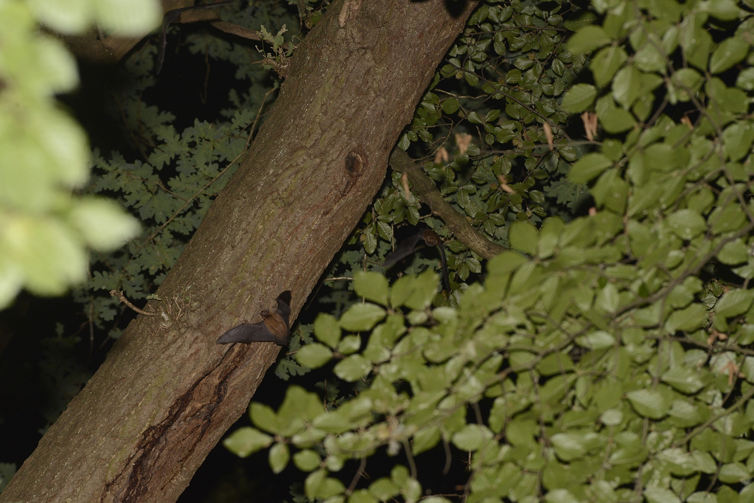 Twee zwermende bosvleermuizen tijdens de vondst van dit vierde kraamverblijf voor Vlaanderen in Haspengouw.